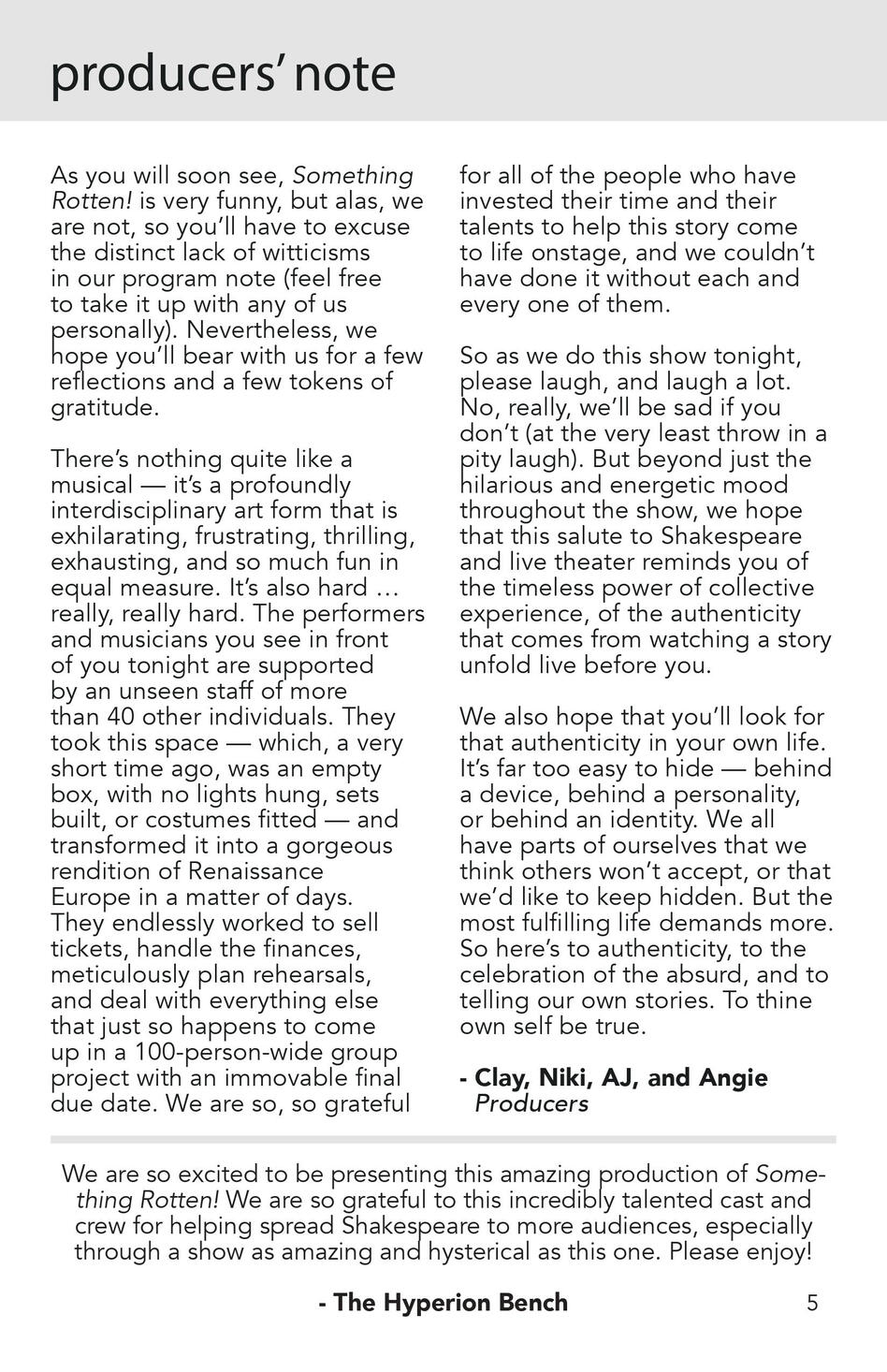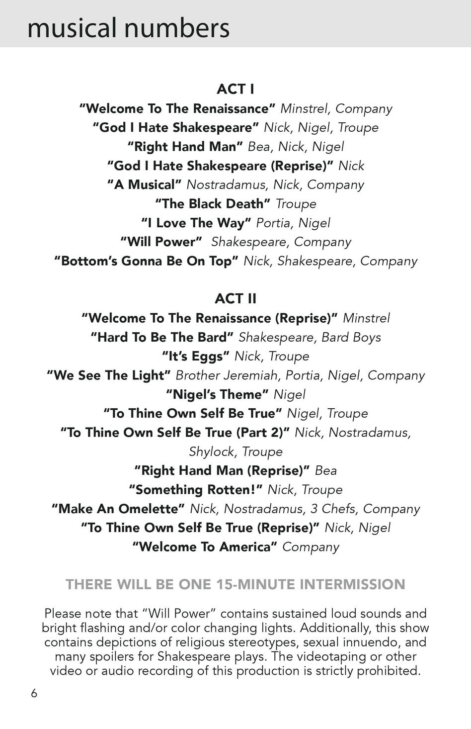 Set at the height of the Renaissance, Something Rotten! tells the story of Nick and Nigel Bottom, two writers who are desperate to write a hit play but feel stuck in the shadow of the beloved Shakespeare. When a local soothsayer foretells that the future of theatre involves singing, dancing and acting at the same time, Nick and Nigel set out to write the world’s first musical. Its satirical style of humor, its Renaissance aesthetic, its catchy musical numbers, and its memorable characters make the show an immersive joy without a dull moment. At the end of the day, it’s a big love letter to musical theatre. Underneath all the silliness, Something Rotten! wholeheartedly and hilariously encourages us: to thine own self be true.